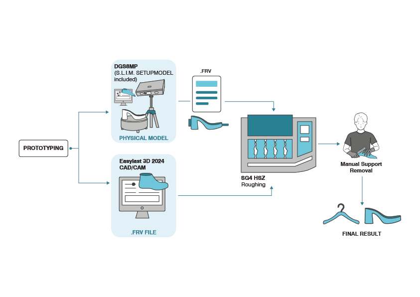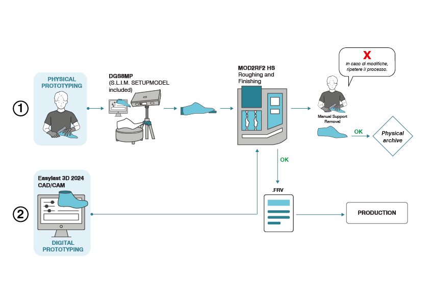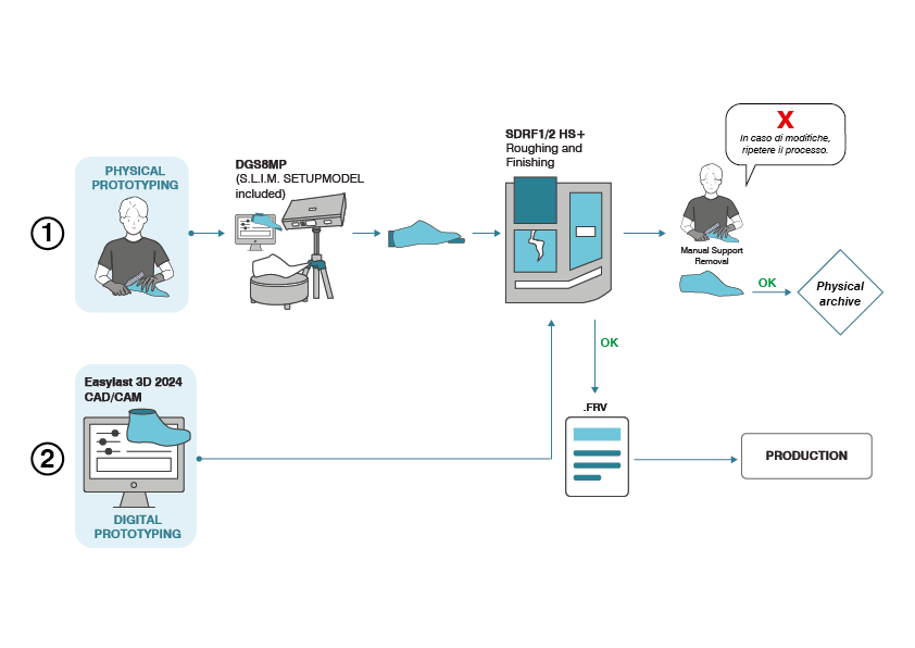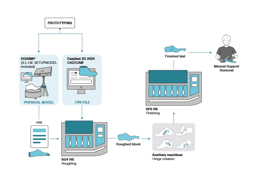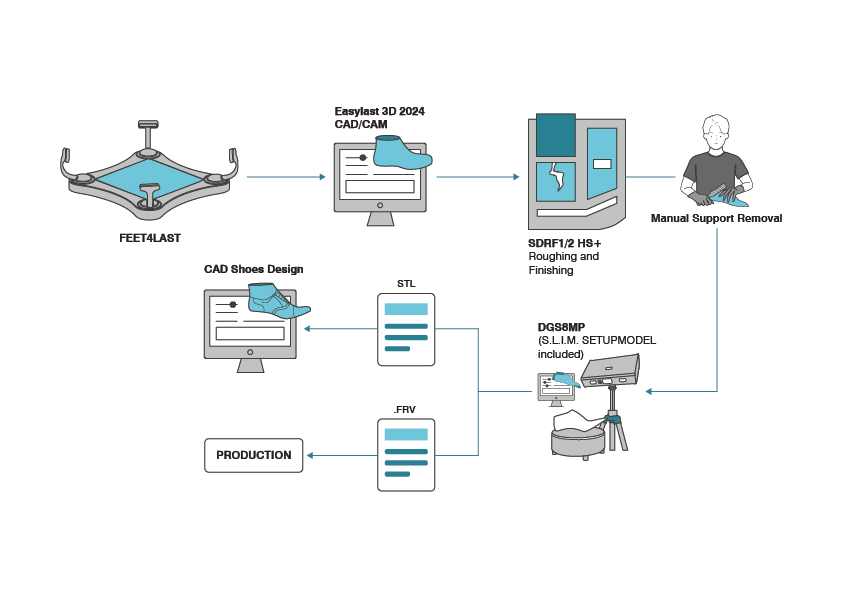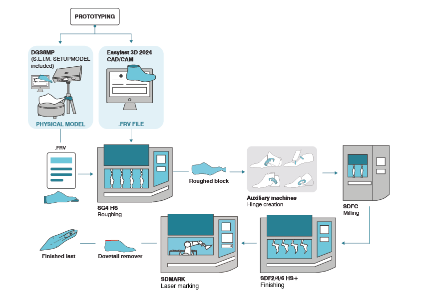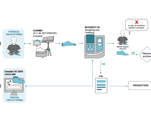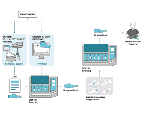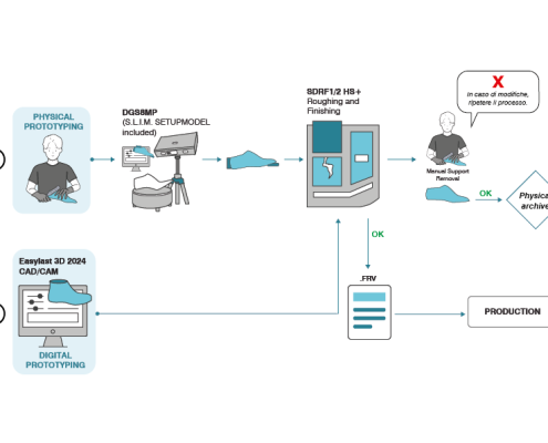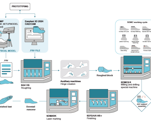 I nuovi cicli produttivi della scarpa prevedono, ad esempio, sistemi per la movimentazione automatica attraverso l’utilizzo di appositi robot, iniezione delle suole direttamente su tomaia e altri processi dove l’intervento dell’uomo si limita alla programmazione, lasciando spazio alla tecnologia. La grande diffusione che stanno avendo questi nuovi sistemi ha fatto innalzare in modo esponenziale la richiesta di forme tecniche adatte alle nuove precisioni richieste.