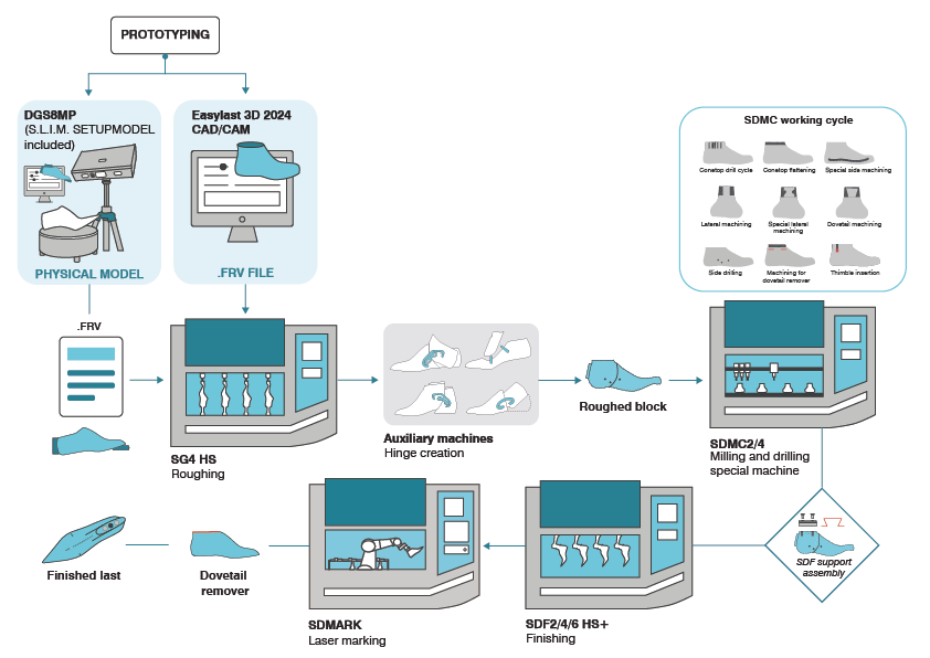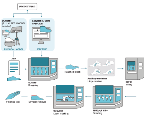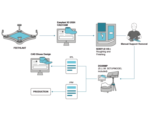 Un vero e proprio ambiente di sviluppo e progettazione virtuale 3D modulare, plasmabile sulle reali esigenze di ogni formificio, che va a raccogliere, in un sistema integrato di semplice utilizzo, tutte le operazioni necessarie per la produzione di forme per calzature: dal posizionamento della forma nell’abbozzo fino alla marcatura laser, dalla progettazione dello snodo fino all’inserimento di bussole e placchette e quanto altro indispensabile per preparare forme adeguate anche all’utilizzo su linee di produzione ad alta automazione.